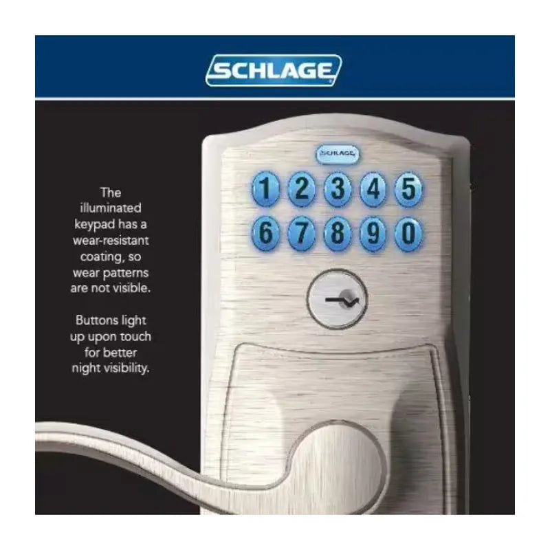 Schlage’s FE575 is a battery-powered, auto-locking keypad lever that fits standard 161 preps. It stores up to 19 user codes, relocks automatically after entry, and includes a conventional key override in Schlage C keyway. Installs with a screwdriver—no wiring.