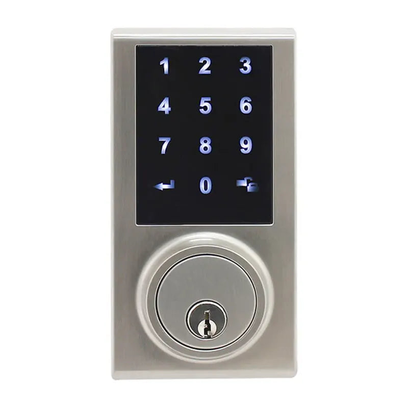 Cal-Royal ZWDB-10 is a Z-Wave enabled touchscreen electronic deadbolt with keyed override. Supports standard 2-1/8″ cross-bore and 1″ edge-bore, adjustable backset 2-3/8″ or 2-3/4″. 30 user codes (4–10 digits), random pre-entry, auto-lock, service code, low-battery alert. Powered by 4× AA.