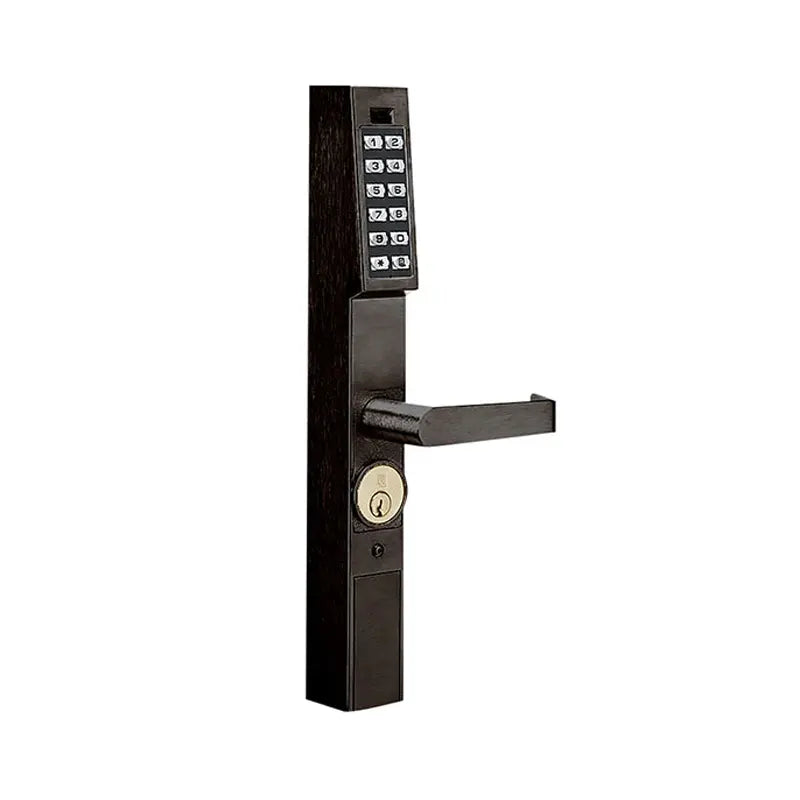 Alarm Lock Trilogy PDL1300 is a narrow-stile access trim for aluminum/glass doors (Adams Rite® deadlatches), with a built-in HID prox reader + keypad for PIN or card entry. Supports 2,000 users, 40,000-event audit trail, and up to 500 scheduled events. Battery powered (2 × CR123A), non-handed, vandal-resistant 12-button metal keypad.