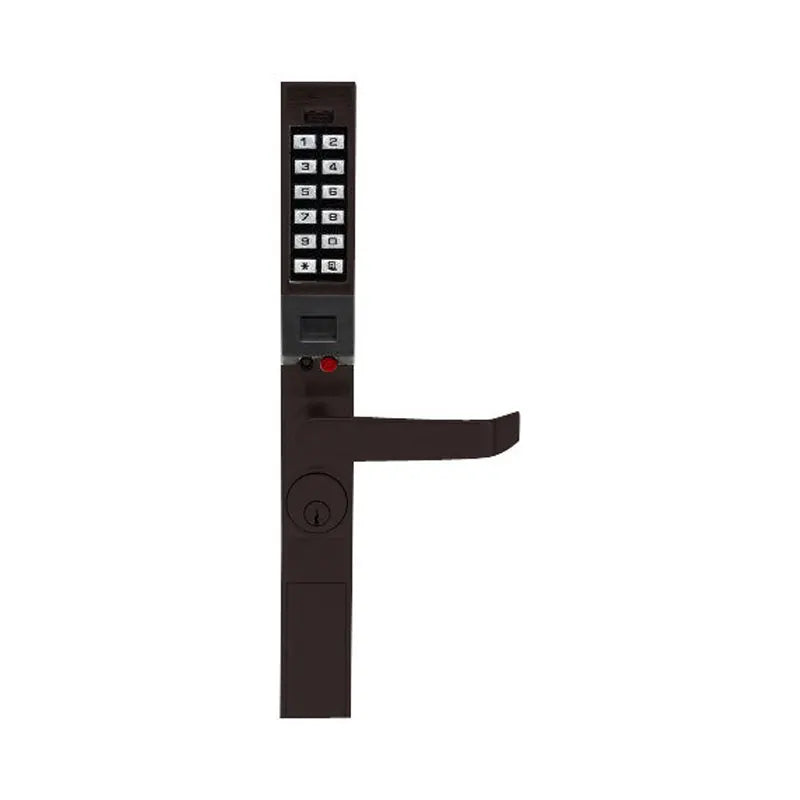 Alarm Lock Trilogy DL1300 is a stand-alone, battery-powered narrow-stile keypad trim for aluminum storefront doors using Adams Rite® style latches/bolts. Supports up to 2,000 users, 40,000-event audit trail, and 500-event schedules; keypad or DL-Windows PC programmable. Weather-resistant with all-metal 12-button keypad and key override. Works with AR 4710/4730/4900 deadlatches and 1850/1950/MS1850S/MS1950 deadbolts (with compatible inside hardware).