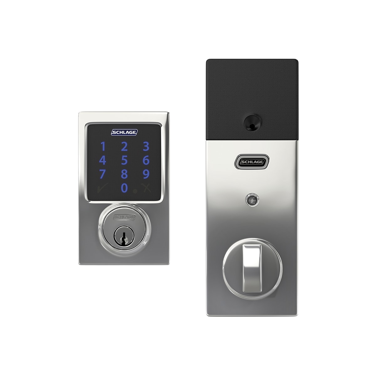 The Schlage Connect touchscreen allows you to lock and unlock doors without the use of a key, an ideal solution for front, back and garage doors. This Schlage BE469ZP Century electronic deadbolt has a keypad on the exterior and a thumb turn on the interior. There is an auto-lock feature associated with this series which will automatically relock the door anytime it’s left unlocked.
