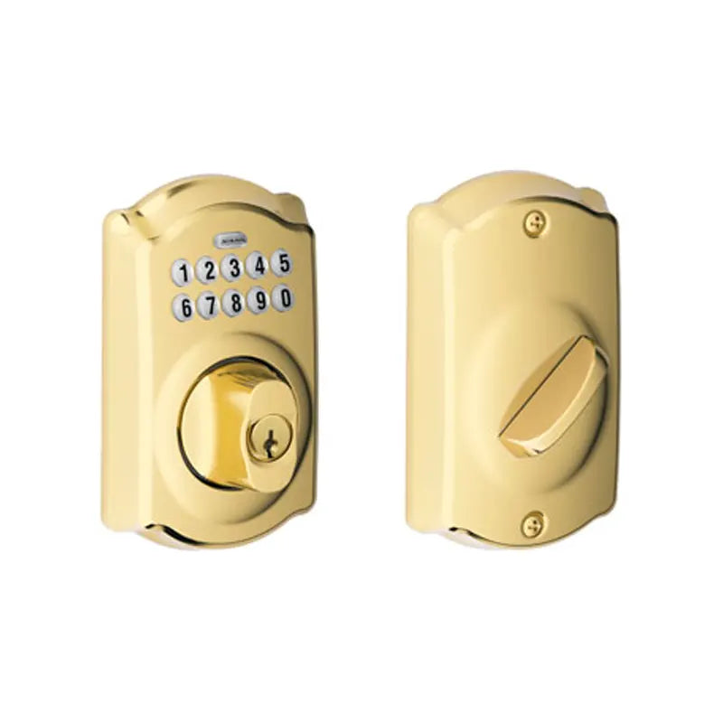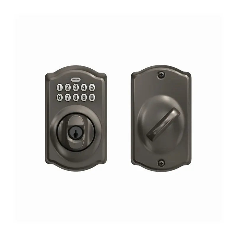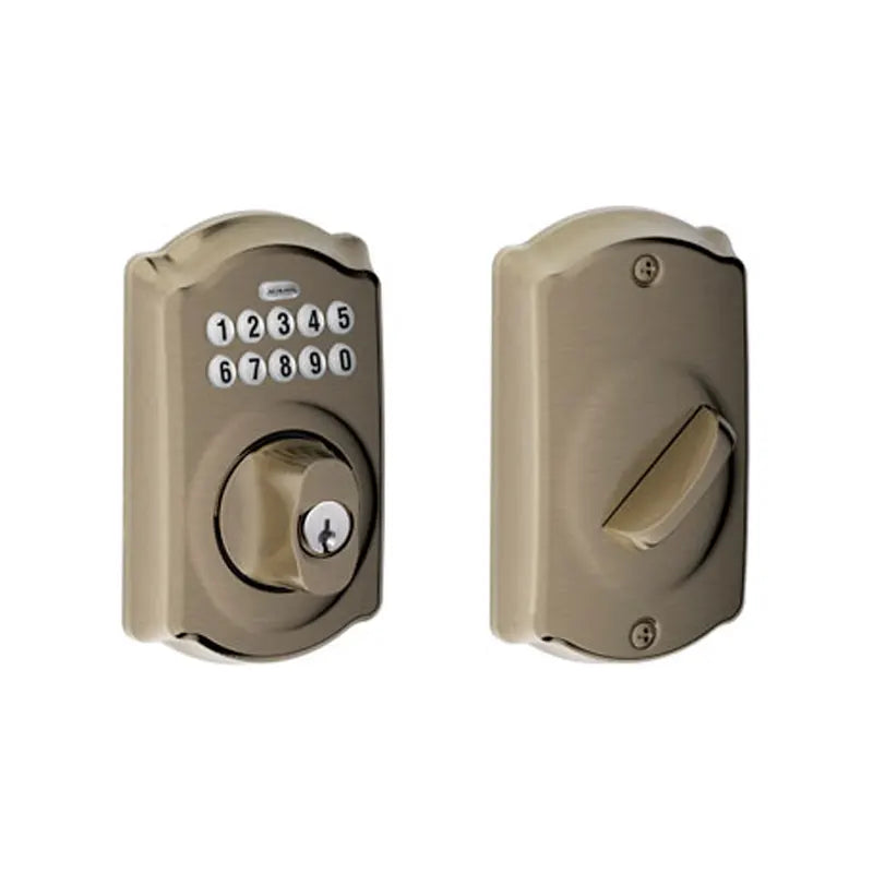 The Schlage BE365 CAM Camelot Electronic Keypad Single Cylinder Deadbolt offers keyless convenience and maximum security with a keypad and lock cylinder on the outside and thumb turn on the inside. You can lock the deadbolt from the outside without a key. Buttons illuminate when you press any button from the exterior. The patented turn lock allows you to lock the deadbolt from the outside without a key. Perfect for front, side, or back doors and garage entry doors, this deadbolt is customizable with up to 19 personalized codes. Installs with a screwdriver in minutes, no wiring required.